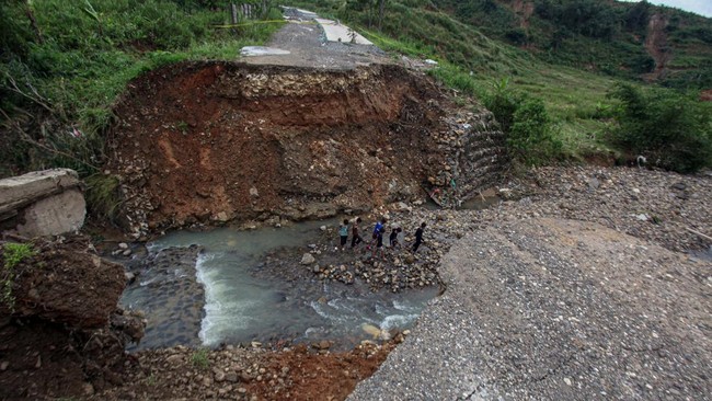 Bogor - Akses jalan penghubung dua desa di Hambalang, Kabupaten Bogor, Jawa Barat, terputus. Hal itu akibat terbawa arus sungai karena hujan deras.