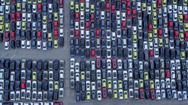 Foto udara sejumlah mobil terparkir di salah satu gudang distributor mobil baru di Kabupaten Kendal, Jawa Tengah, Jumat (29/11/2024).