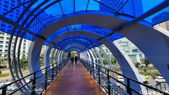 Jakarta - Pemprov Jakarta menyelesaikan pembangunan JPO Mas Mansyur sepanjang 39,6 meter. Desain JPO ini mengadopsi guratan pada proses penyadapan getah karet.