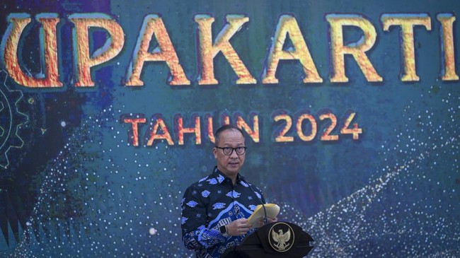 Menteri Perindustrian Agus Gumiwang Kartasasmita memberikan paparan saat Penghargaan Upakarti 2024 di Gedung Kementerian Perindustrian, Jakarta, Kamis (19/12/2024). Kementerian Perindustrian (Kemenperin) menganugerahkan Penghargaan Upakarti 2024 kepada tujuh penerima kategori Jasa Pengabdian dan tiga penerima kategori Jasa Kepeloporan sebagai apresiasi atas peran aktif mereka dalam pemberdayaan industri kecil dan menengah (IKM) di Indonesia. Masing-masing penerima memperoleh piagam, trofi, dan uang pembinaan sebesar Rp 50 juta.