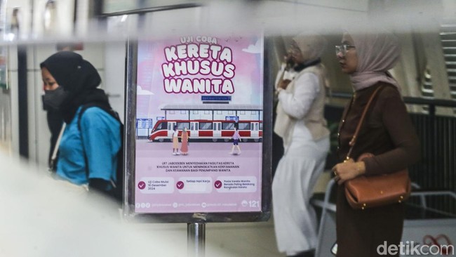 Jakarta - Gerbong khusus wanita di LRT Jabodebek resmi beroperasi. Kehadiran gerbong khusus wanita ini untuk menjaga kenyamanan dan keamanan penumpang, khususnya wanita.