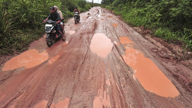 Jambi - Jalan di Desa Ladang Panjang, Muaro Jambi, Jambi, rusak parah. Begini kondisinya.