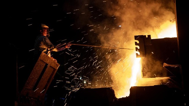 Pekerja melakukan peleburan timah di Divisi Pengolahan dan Peleburan Unit Metalurgi PT Timah Tbk di Mentok, Kabupaten Bangka Barat, Kepulauan Bangka Belitung, Rabu (22/1/2025).