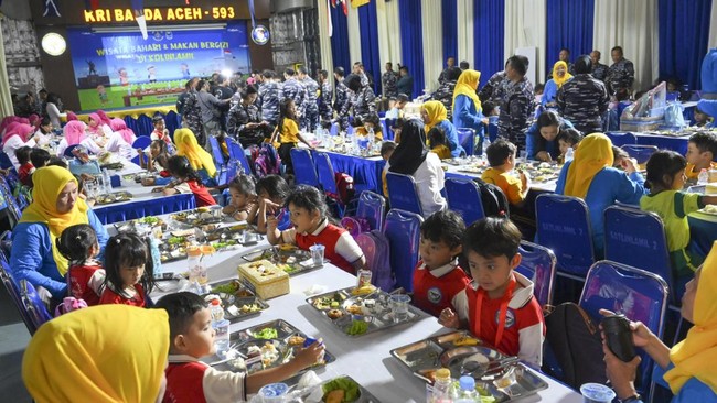 Jakarta - Tidak hanya di sekolahan, program makan bergizi gratis juga digelar di KRI Banda Aceh 593. Sebanyak 270 siswa SD dan PAUD mengikuti program tersebut.