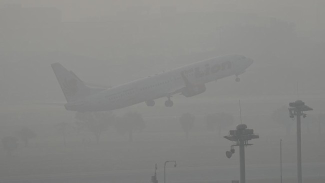 Sebuah pesawat penumpang Thai Lion lepas landas dari bandara Don Muang yang diselimuti kabut asap tebal di Bangkok, Thailand, Senin (3/2).