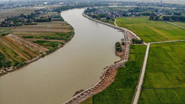 Foto udara kondisi tanggul sungai Bengawan Solo yang ambruk di Baureno, Bojonegoro, Jawa Timur, Kamis (13/2/2025).