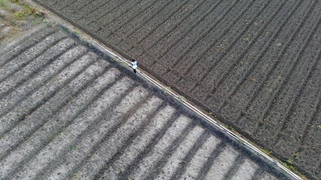 Foto udara seorang petani mempersiapkan lahannya untuk ditanami bawang merahnya di Desa Kotarindau, Sigi, Sulawesi Tengah, Kamis (13/2/2025).