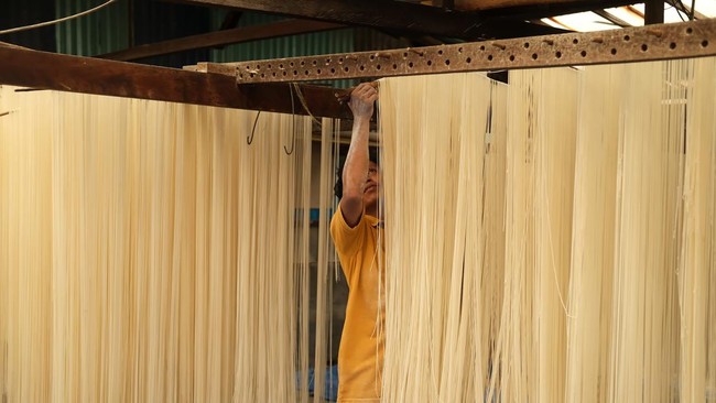 Pekerja menjemur mie asin di pabrik Mee Sua Asin Bunga di Jalan Kridasana, Kota Singkawang, Senin (17/2/2025).