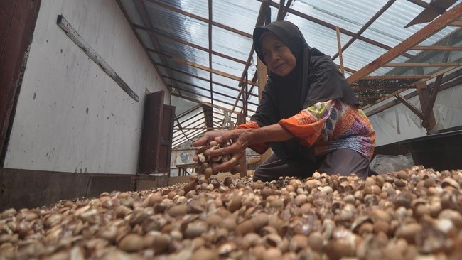 Seorang pekerja menjemur buah pinang di salah satu rumah produksi di Kabupaten Kaur, Bengkulu, Senin (17/2/2025).