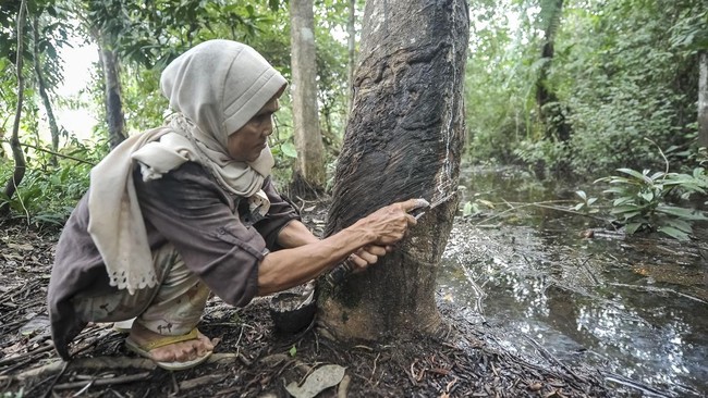 Jambi - Warga memanen getah karet di Muaro Jambi, Jambi. Getah tersebut digunakan untuk bahan bakar alat penerangan tradisional atau sumber energi alternatif.