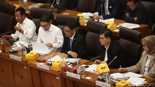 Wakil Menteri ESDM Yuliot (tengah) bersama Sekretaris Jenderal ESDM Dadan Kusdiana (kiri) dan Direktur Jenderal Ketenagalistrikan Jisman Parada Hutajulu (kanan) mengikuti rapat kerja dengan Komisi XII DPR di Kompleks Parlemen, Senayan, Jakarta, Rabu (26/2/2025).