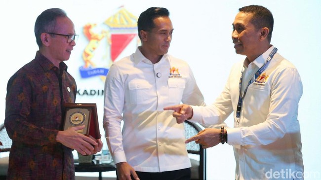 Mahendra Siregar Ketua Dewan Komisioner Otoritas Jasa Keuangan Republik Indonesia, Anindya Novyan Bakrie Ketua Umum Kadin Indonesia dan Kamrussamad Wakil Ketua Umum Kadin Indonesia Bidang Fiskal Moneter dan Industri Keuangan berbincang saat diskusi di Menara Kadin, Jakarta, Jumat (28/2/2025).