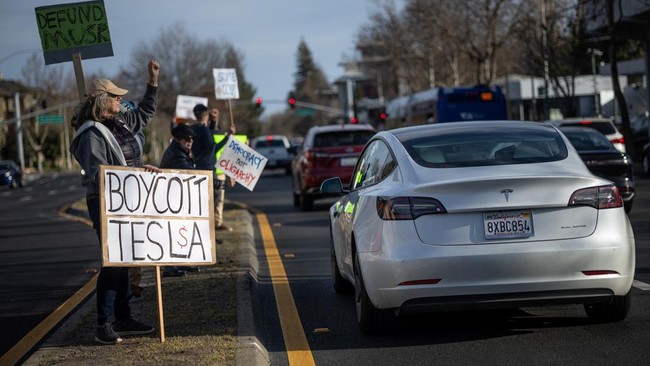 California - Puluhan demonstran berkumpul di dealer Tesla di Palo Alto, California. Massa mengutuk pemilik perusahaan Elon Musk atas perannya dalam pemotongan anggaran AS.
