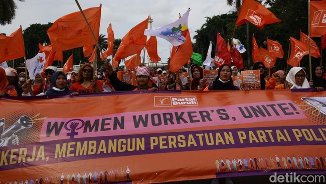 Jakarta - Buruh wanita menggelar aksi untuk memperingati Hari Perempuan Internasional di Patung Kuda. Mereka menyuarakan beberapa tuntutan.