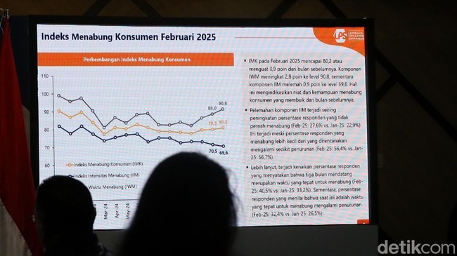 Jakarta - Lembaga Penjamin Simpanan (LPS) melaporkan Indeks Menabung Konsumen (IMK) pada bulan Februari 2025 mencapai level 80,2. Angka ini menguat dari bulan sebelumnya.