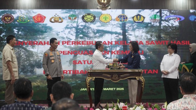 Jakarta - Satgas PKH melakukan serah terima 216 hektare lebih perkebunan kelapa sawit untuk dikelola BUMN. Lahan itu merupakan hasil penertiban yang dilakukan Satgas PKH.