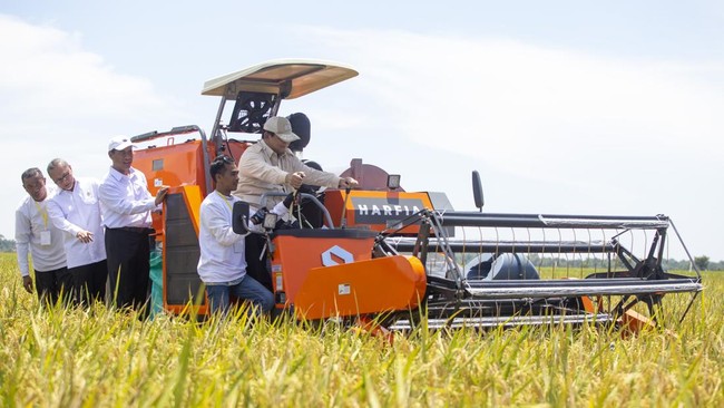Majalengka - Presiden Prabowo Subianto mengikuti panen raya padi di Desa Randegan Wetan, Ligung, Majalengka, Jawa Barat. Ini momen Prabowo mengoperasikan mesin pemanen padi.