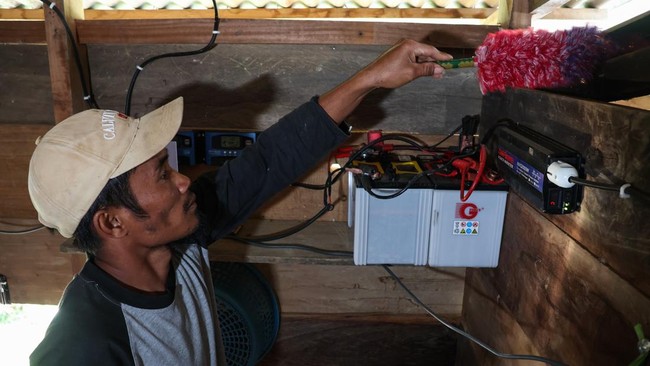 Seorang warga melakukan perawatan instalasi jaringan listrik panel surya di rumahnya di Desa Embonatana, Kecamatan Seko, Sulawesi Selatan, Kamis (10/4/2025).