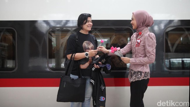 Jakarta - Dalam rangka Hari Kartini, KCIC menggelar perayaan di Stasiun Halim. Petugas Whoosh berbaju kebaya dan membagikan bunga kepada penumpang perempuan.