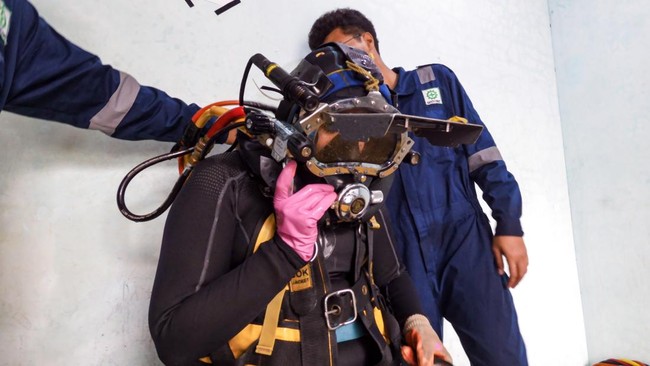 Jakarta - Peserta pelatihan kerja melakukan pengelasan (welding) dalam air di Pusat Pelatihan Kerja Khusus Pengembangan Las (PPKKPL), Jakarta. Yuk lihat.