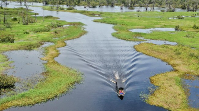 Foto udara penjual elpiji pangkalan membawa elpiji 3 kg menggunakan perahu ketinting menyusuri Danau Melintang di Desa Enggelam, Kecamatan Muara Wis, Kabupaten Kutai Kartanegara, Kalimantan Timur, Sabtu (17/5/2025). Perjalanan itu menjadi bagian dari upaya rutin untuk memastikan warga di wilayah terpencil tetap mendapatkan akses energi yang terjangkau.