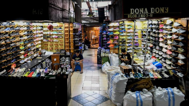 Penjual sepatu terlihat menunggu calon pembeli di Sentra Sepatu Taman Puring, Jakarta, Jumat (4/7/2025). Suasana pasar mulai dipadati pengunjung jelang tahun ajaran baru. ANTARA FOTO/Muhammad Adimaja