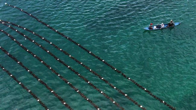Foto udara petani menuju lokasi pembibitan rumput laut coklat (Phaeophyta) di perairan Desa Liya Raya, Wakatobi, Sulawesi Tenggara, Jumat (22/8/2025). ANTARA FOTO/Andry Denisah