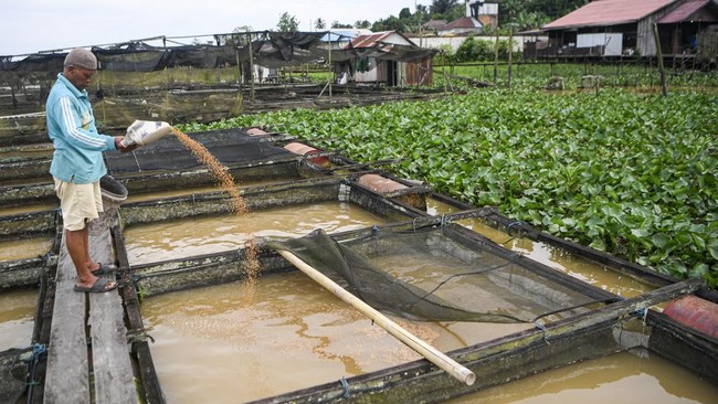 Seorang petani memberi pakan ikan mas di keramba Sungai Mahakam, Kutai Kartanegara, Kalimantan Timur, Senin (25/8/2025). Foto: ANTARA FOTO/M Risyal Hidayat