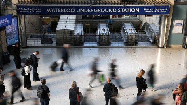 Para pengguna jalan berhenti dan berjalan melewati pintu masuk London Underground yang ditutup saat pemogokan kereta bawah tanah berlanjut, pada jam sibuk di Stasiun Waterloo di London, Inggris. Foto: REUTERS/Toby Melville