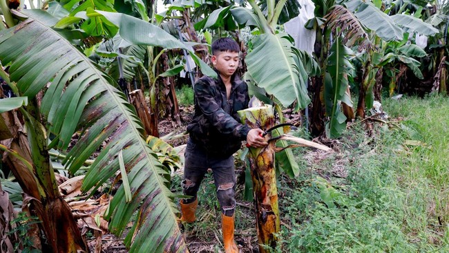 Seorang pekerja mengumpulkan bagian tengah tanaman pisang, yang dikenal sebagai pseudostem, yang biasanya tertinggal di ladang setelah panen. Batang pisang ini akan diolah untuk dijadikan bahan kain, di Pingtung, Taiwan. Foto: REUTERS/Ann Wang