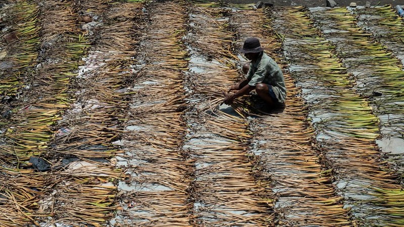 Warga menjemur eceng gondok di Pakuhaji, Kabupaten Tangerang, Banten, Rabu (1/10/2025). Tanaman gulma ini dijual ke perajin kerajinan tangan. Foto: ANTARA FOTO/Putra M. Akbar