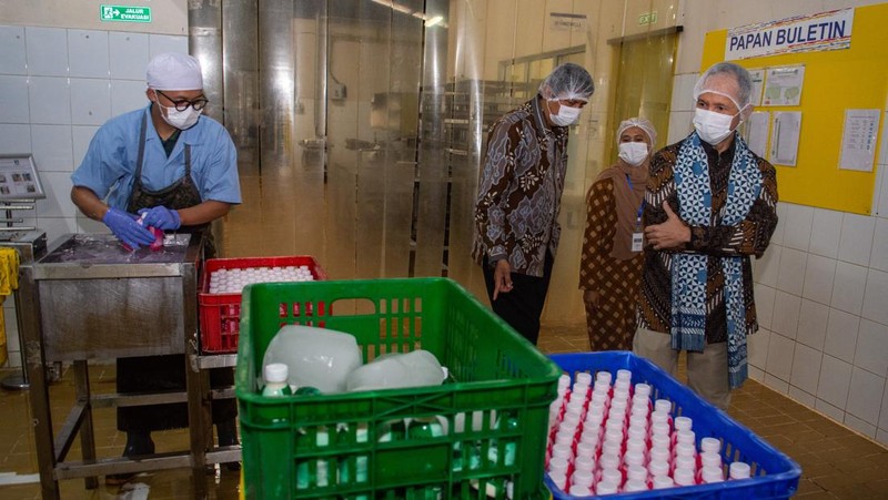 Ketua Dewan Komisioner Otoritas Jasa Keuangan (OJK) Mahendra Siregar (kanan) didampingi Kepala Kantor OJK Provinsi Jawa Barat Darwisman (ketiga kanan) meninjau ruang produksi saat kunjungan bersama delegasi negara Swiss di unit produksi Koperasi Produsen Peternakan Bandung Selatan (KPBS) Pangalengan, Kabupaten Bandung, Jawa Barat. Foto: ANTARA FOTO/Novrian Arbi
