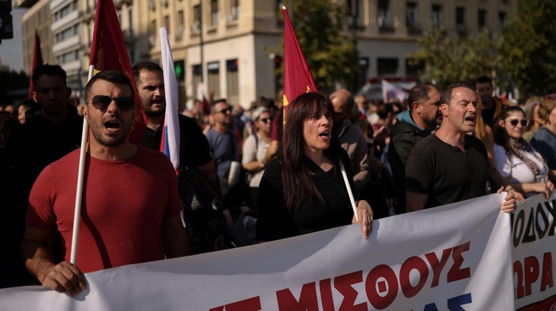 Aksi yang digelar di ibu kota Athena pada Selasa (14/10/2025), diikuti berbagai serikat pekerja, termasuk kelompok pendukung Partai Komunis Yunani. REUTERS/Stelios Misinas