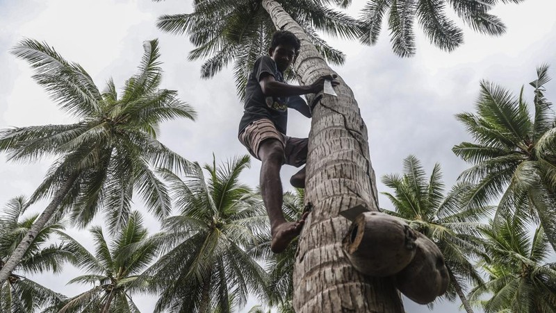 Seorang petani memanjat pohon kelapa di Desa Tawa Pulau Bacan, Kabupaten Halmahera Selatan, Maluku Utara, Senin (10/11/2025). Foto: ANTARA FOTO/Andri Saputra