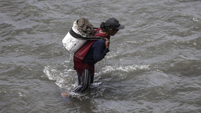 Warga memanggul pasir yang diambil di pinggir pantai melewati sungai Mandaong, Pulau Bacan, Kabupaten Halmahera Selatan, Maluku Utara, Selasa (11/11/2025). ANTARA FOTO/Andri Saputra