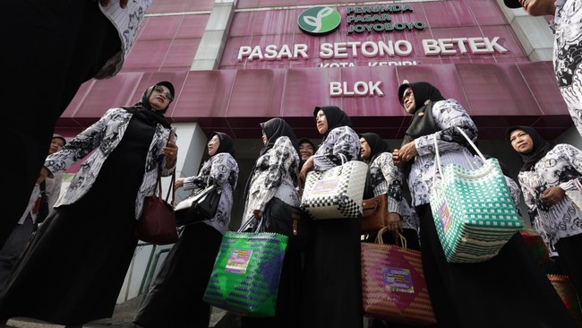 Kediri - Pasar Setono Betek di Kota Kediri, tampak lebih ramai dari biasanya. Sejak pagi, ratusan guru datang dengan mengenakan seragam dan membawa keranjang belanja.
