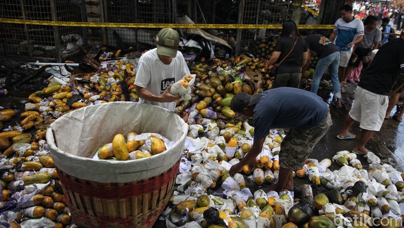 Setelah api berhasil dikendalikan, pedagang terlihat berupaya menyelamatkan pepaya yang tidak terbakar.