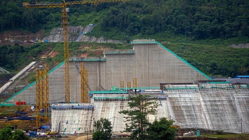 Pekerja menggunakan crane untuk menyelesaikan pembangunan Proyek Strategis Nasional (PSN) Bendungan Jenelata di Kecamatan Manuju, Kabupaten Gowa, Sulawesi Selatan. Foto: ANTARA FOTO/Hasrul Said