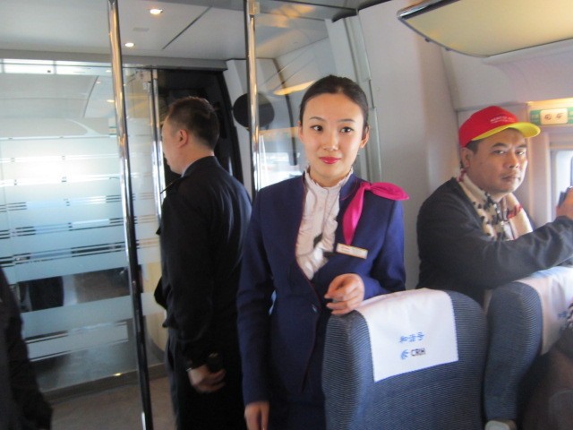 Rombongan 91 pegawai PT Kereta Api Indonesia (KAI) yang ikut program studi banding 'Melihat China dalam Perspektif Perkeretaapian' berkesempatan menjajal kereta CRH tersebut, Senin (18/3/2013). Layaknya kereta eksekutif, CRH juga dilengkapi dengan layanan pramugari di dalam kereta.