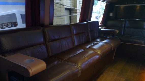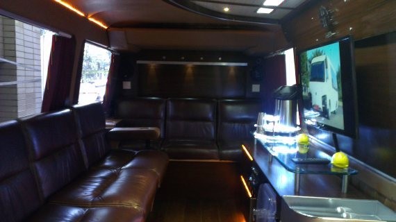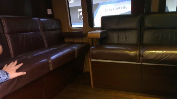 Kursi tersebut sangat empuk, dan dilengkapi tempat minum di setiap sandaran tangannya. Tak hanya itu, terdapat juga meja kecil layaknya minibar di dalam bus ini, tepat di atas meja tersebut terpampang TV layar datar ukuran 24 inci.