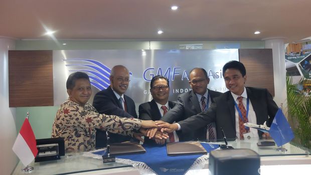 Penandatangan kerja sama dilakukan oleh Dirut GMF Richard Budihadianto dan Dirut PT RAI Agung Nugroho di stand Garuda Indonesia Group di ajang Singapore Airshow, Kamis (18/2/2016).