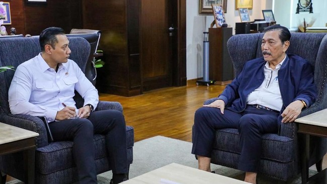 Menteri Agraria dan Tata Ruang/Kepala Badan Pertanahan Nasional (ATR/BPN) Agus Harimurti Yudhoyono (AHY) bertemu Menteri Koordinator Bidang Kemaritiman dan Investasi Luhut Binsar Pandjaitan.
