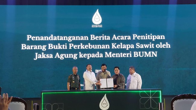 Acara ini didahului oleh penandatanganan Berita Acara Penitipan Barang Bukti Perkebunan Kelapa Sawit oleh Jaksa Agung kepada Menteri BUMN. Dilanjutkan dengan Berita Acara Penyerahan Penitipan Barang Bukti Perkebunan Kelapa Sawit dari Menteri BUMN kepada Direktur Utama PT Agrinas Palma Nusantara (Persero).