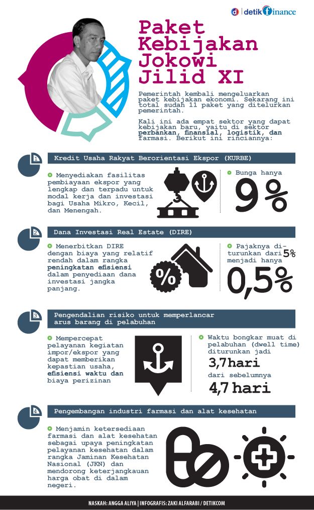 Infografis Paket Ekonomi Jokowi Jilid XI Fokus di 4 Sektor Maikel Jefriando - detikFinance Selasa, 29 Mar 2016 19:07 WIB Foto: Maikel Jefriando-detikFinance Jakarta - Pemerintah baru saja merilis paket kebijakan ekonomi jilid XI. Paket ini fokus pada kebijakan di 4 sektor yaitu, perbankan, finansial, logistik, dan farmasi.Berikut isi paket kebijakan ekonomi jilid XI dalam infografis:Paket Ekonomi Jokowi Jilid XI (hns/dna) Infografis Lainnya Infografis Strategi ASN Persiapkan Masa Pensiun Infografis Mengenal Etanol dan Keunggulannya sebagai Bahan Campuran BBM Infografis Kinerja LPS Triwulan II 2025: Simpanan Tembus Rp 9.550 T paket kebijakan ekonomi