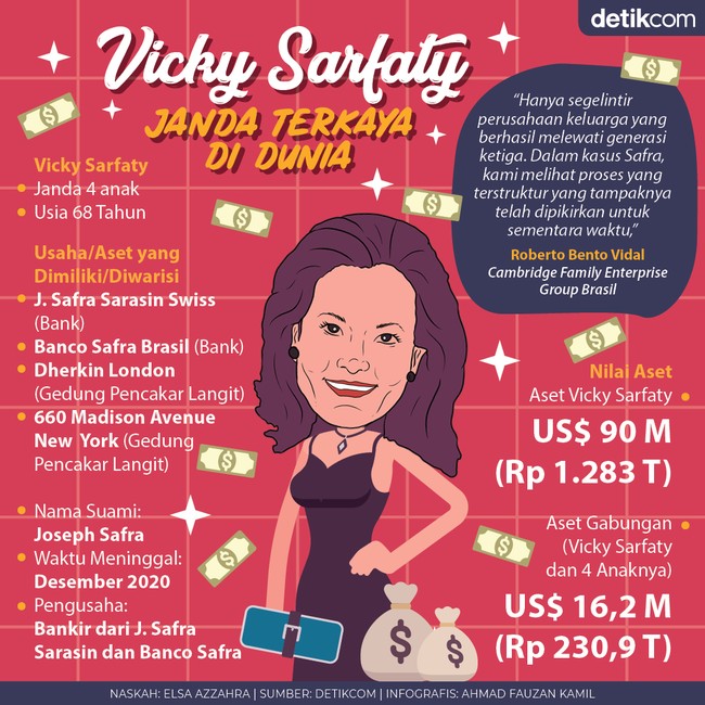 Sebelum meninggal, Joseph Safra adalah bankir terkaya di dunia. Kini beberapa aset keluarga yang paling berharga telah diberikan kepada Vicky Sarfaty yang berusia 68 tahun.