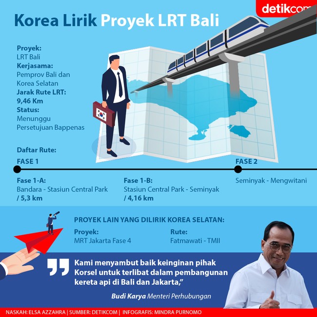 Jakarta - Korea Selatan mengincar proyek LRT Bali. Hal itu terungkap dalam pertemuan antara Menteri Perhubungan Budi Karya Sumadi dengan Duta Besar Korea Selatan untuk Indonesia Park Tae-Sung. Ada dua fase proyek LRT yang terdiri dari 3 rute, dikaji Korea Selatan Berikut penjelasannya dirangkum dalam infografis berikut ini.