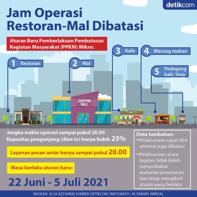 Jakarta - Pemerintah memperketat Pemberlakuan Pembatasan Kegiatan Masyarakat (PPKM) Mikro. Salah satunya membatasi jam operasional pusat perbelanjaan hingga restoran, termasuk warung makan hingga pukul 20.00. Kebijakan itu mulai berlaku 22 Juni hingga 5 Juli 2021.