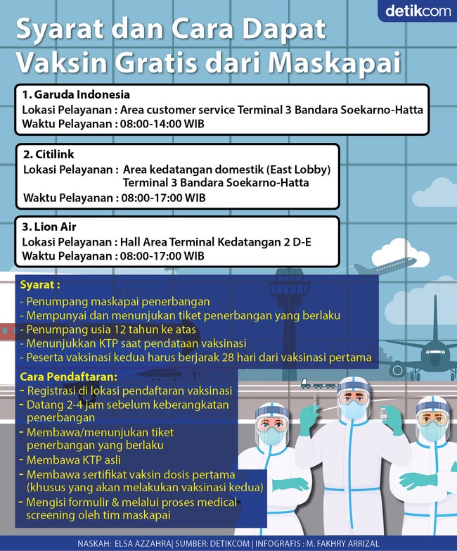 Jakarta - Sejumlah maskapai menawarkan vaksinasi COVID-19 gratis kepada penumpang. Simak syarat dan cara dapatnya.