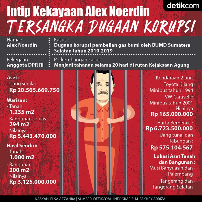 Jakarta - Anggota DPR RI Alex Noerdin ditetapkan menjadi tersangka kasus korupsi. Kejaksaan Agung (Kejagung) menetapkan Alex sebagai tersangka dugaan korupsi pembelian gas bumi oleh BUMD Sumatera Selatan.