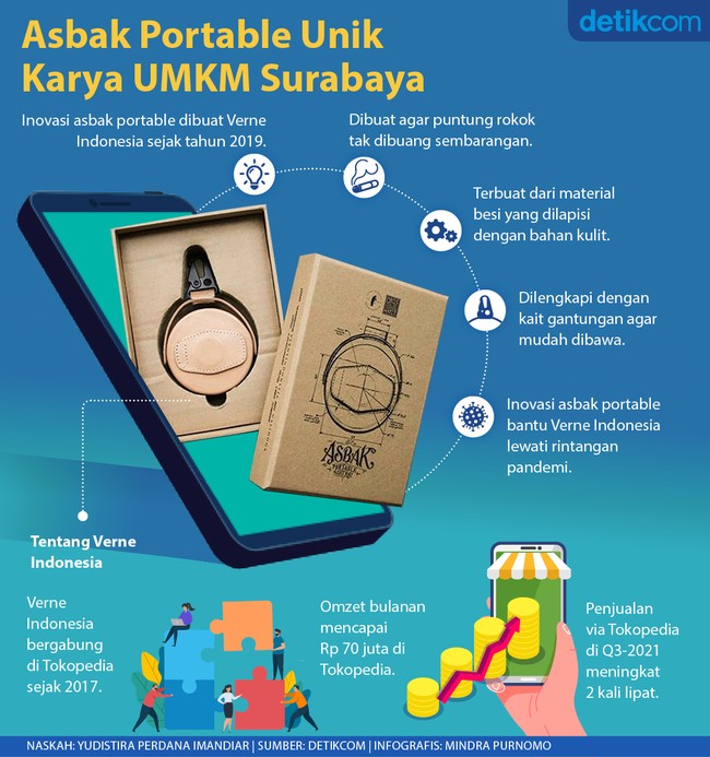 Sejak 2019, UMKM asal Surabaya, Verne Indonesia, berinovasi membuat asbak portable. Produk itu lantas menjadi item unggulan yang membuat Verne Indonesia bertahan dari rintangan pandemi.